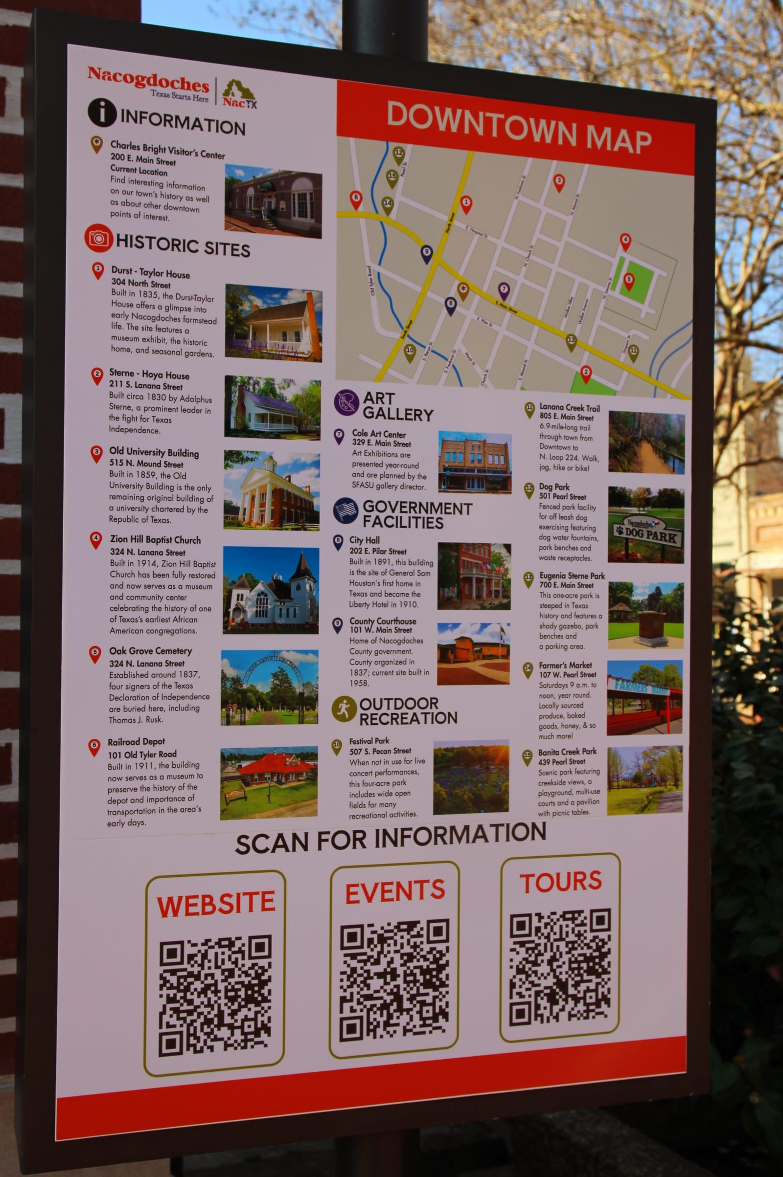 Begin your trip to Nacogdoches with a visit to the Charles Bright Visitor Center located in Plaza Principal in the historic downtown district. You will find a staff eager to assist you during your stay along with maps, information and valuable insight into our historic community.