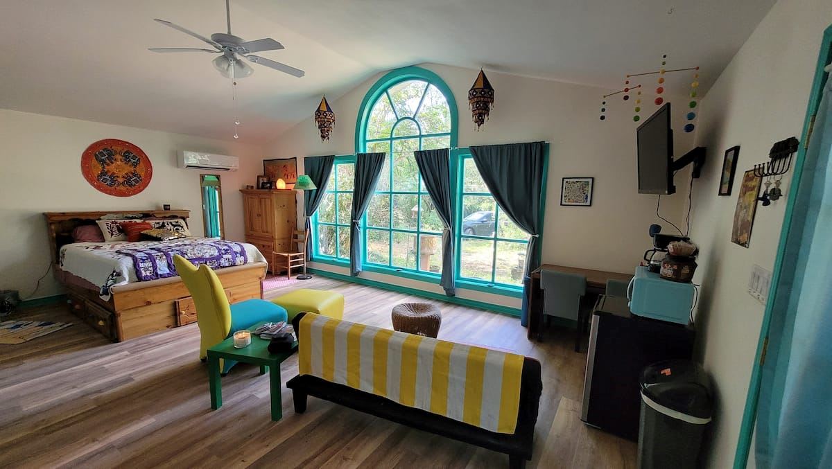 We are delighted to welcome you to our colorful guesthouse. The main feature is an 11 foot bay window perfect for bird watching and enjoying our natural garden space. Our garden cottage is perfect for a quick trip to Nacogdoches and for travelers seeking inspiration. We are within walking distance to downtown Nacogdoches.