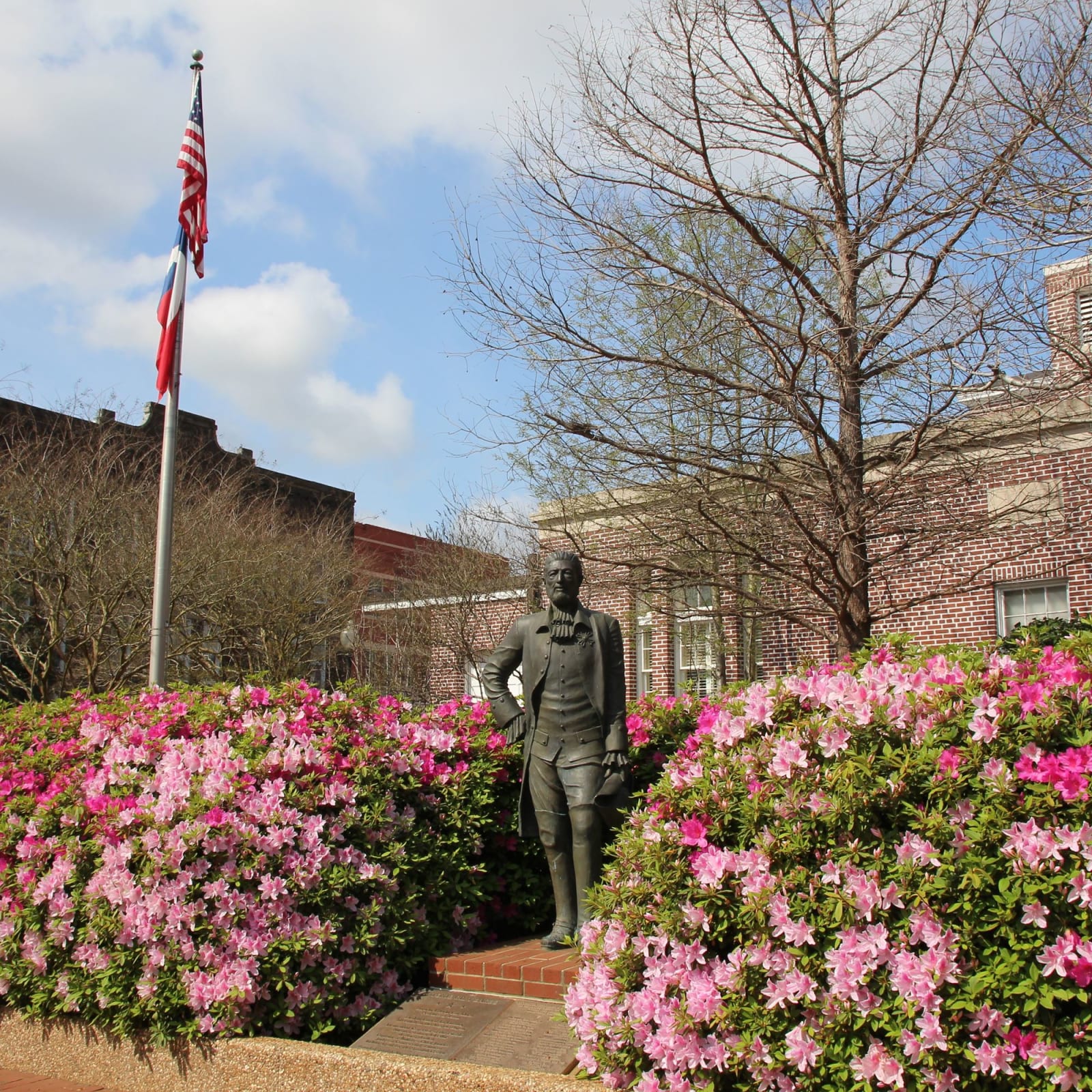 The beautifully landscaped town square is shaded by crape myrtles, camellias and includes show stopping azaleas. You will find a variety of other seasonally planted color throughout the year.